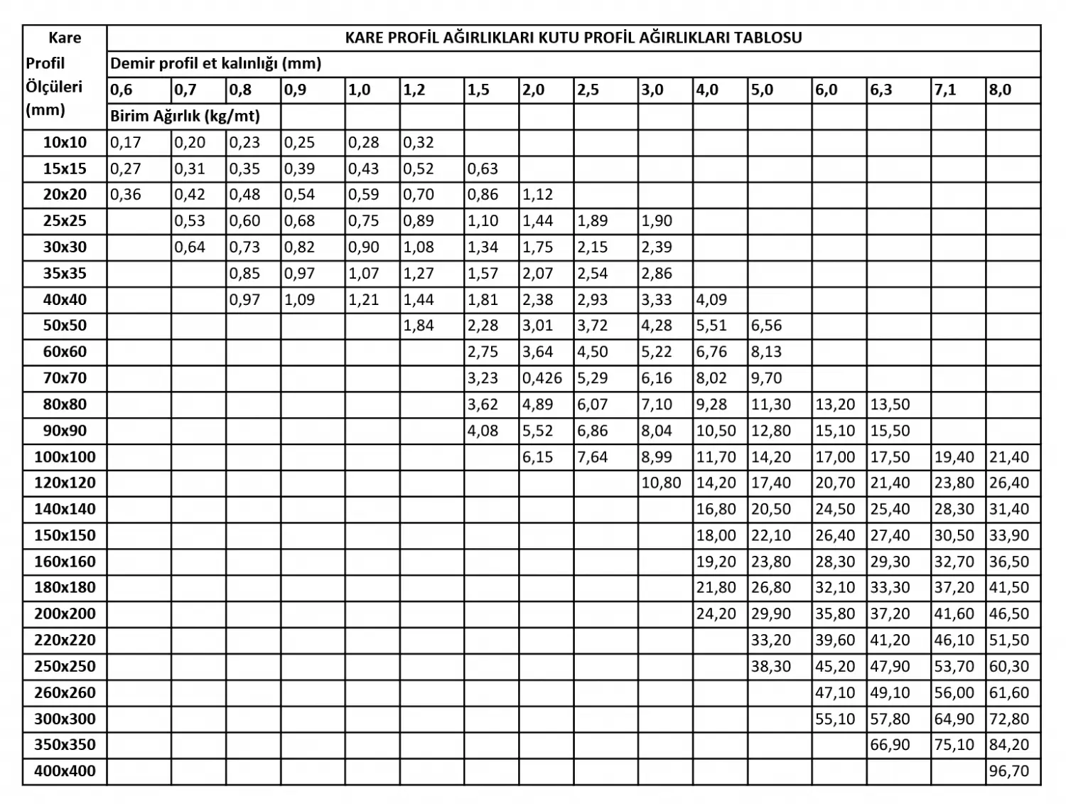 Kutu Profil Ağırlık Tablosu